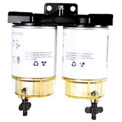 Filtro de combustible para fuerabordas con cabezal de aluminio, cazoleta transparente y racores. Filtro de 10 micras. Reemplaza filtro Mercury 35-60494-1, Racord S3123 y universales. Medidas 230x106 mm. Rosca del cabezal: 3/8” NTP. Manguera 10 mm.